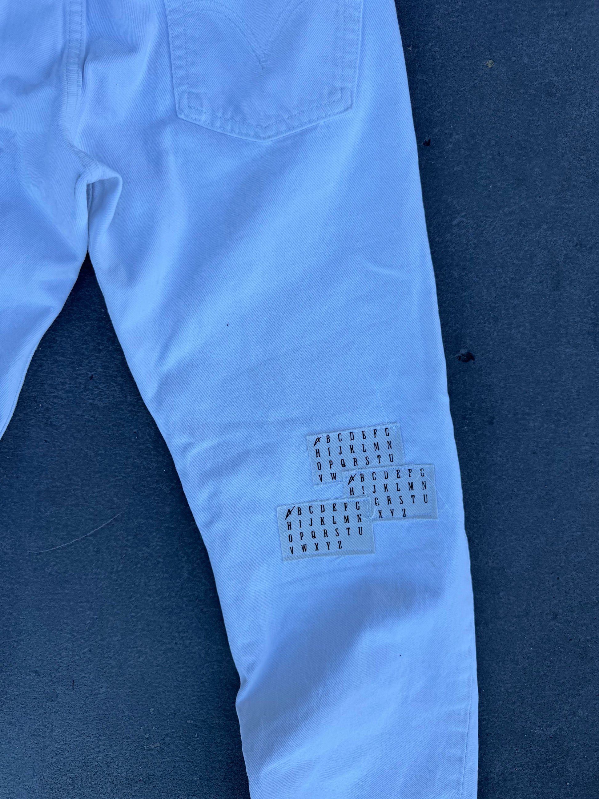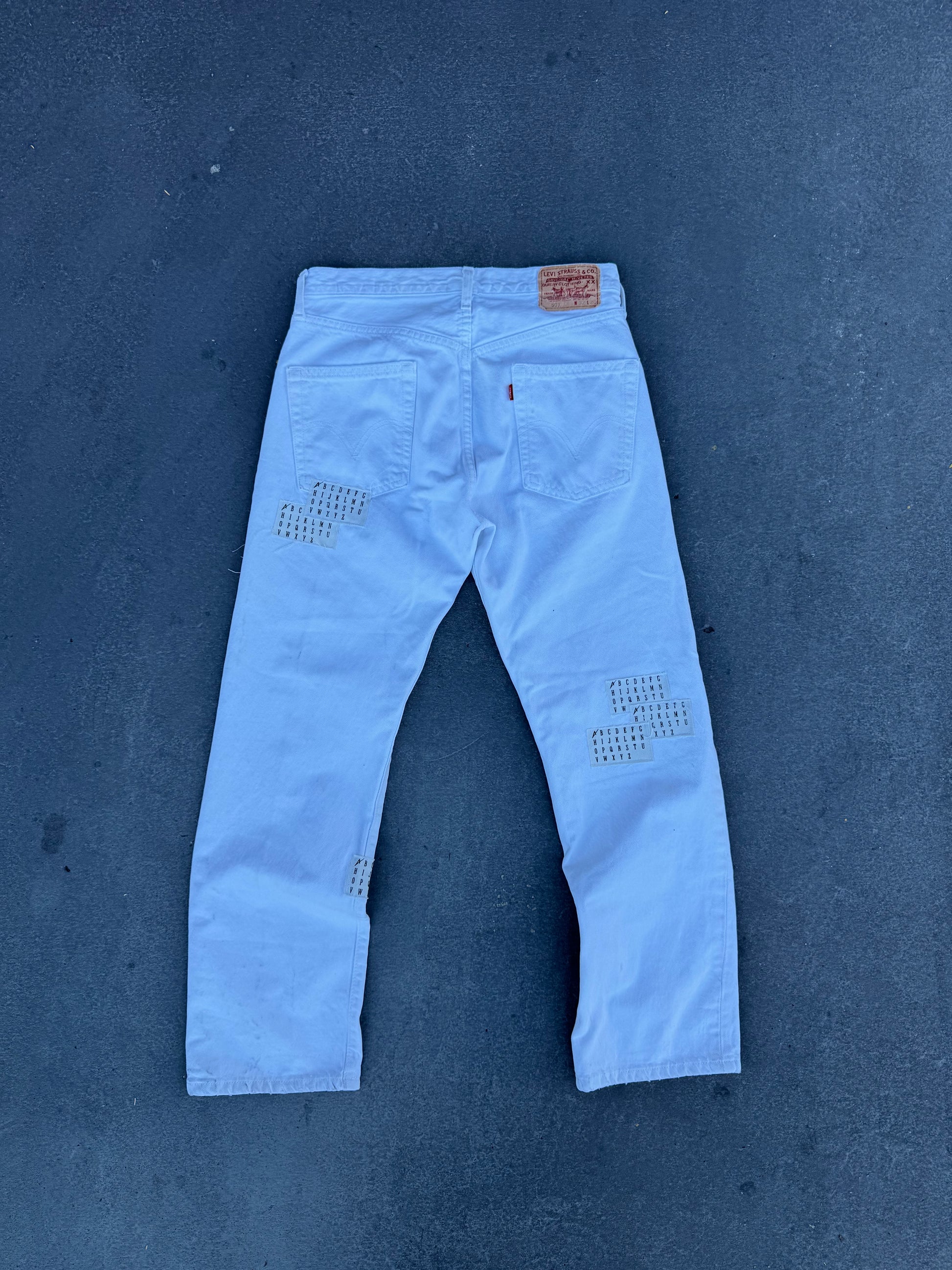 These reworked vintage white Levis 501 jeans feature custom patches across the legs, giving them a futuristic industrial look. The straight, relaxed fit makes them easy to style, while the patch placements add structure and dimension.