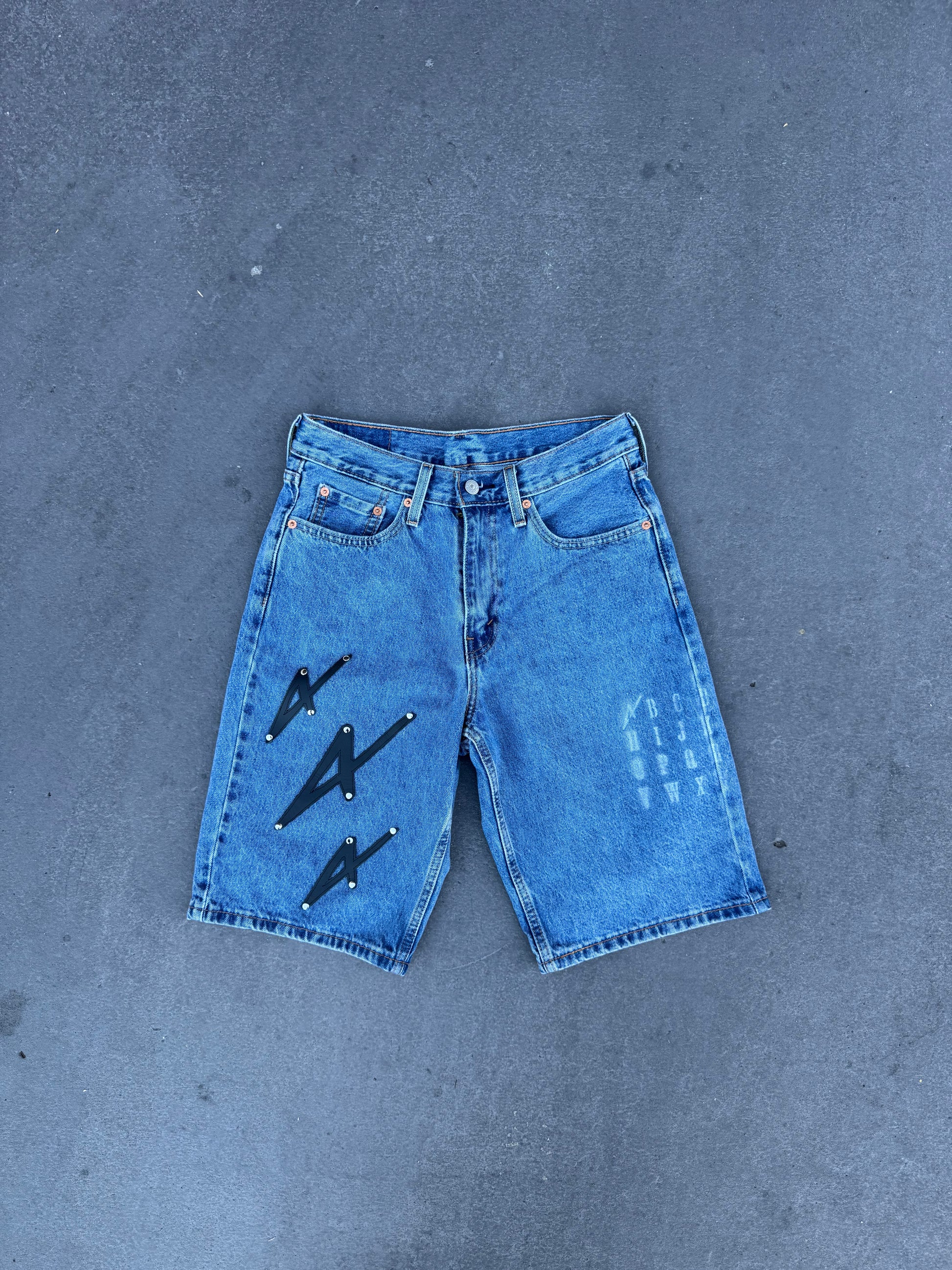 Crafted from sturdy mid-wash blue Levi’s denim, these shorts combine classic Levi’s styling with elevated hrtlss hardware detailing. Three angled “A” emblems create a bold stacked design on one leg, paired with a grid print on the other for balance and edge.