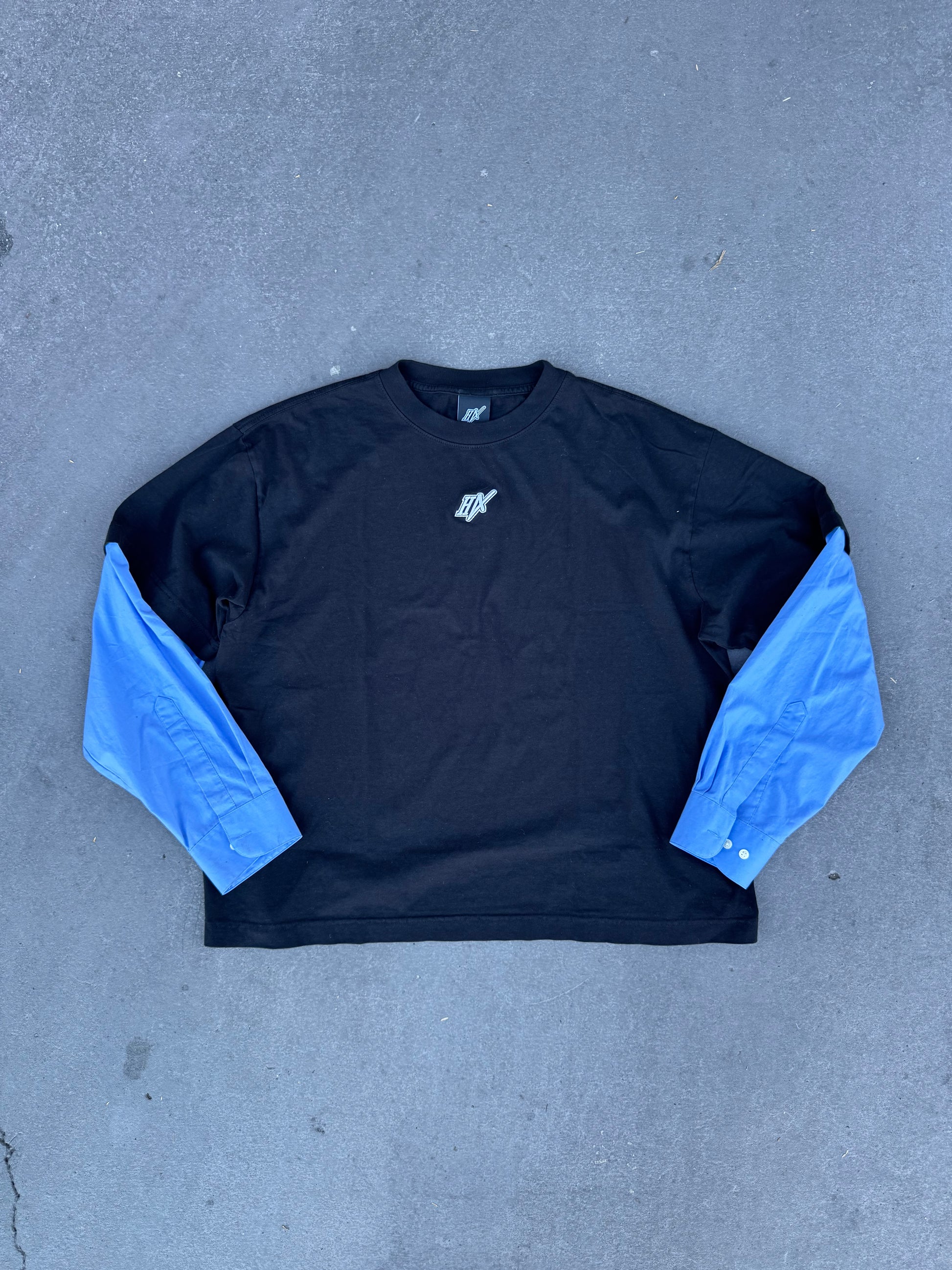 A unique hybrid long-sleeve tee that blends streetwear with modern tailoring. The body features our HRTLSS sustainable tee with a small embroidered chest logo, while the sleeves contrast in crisp blue button-cuff fabric — giving the illusion of layered styling without the bulk.