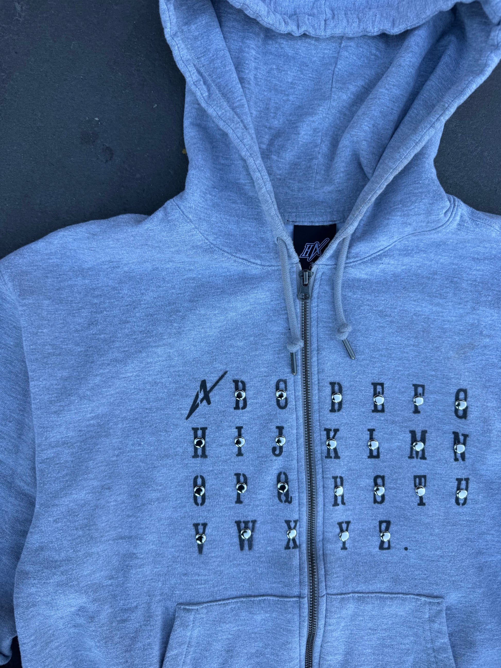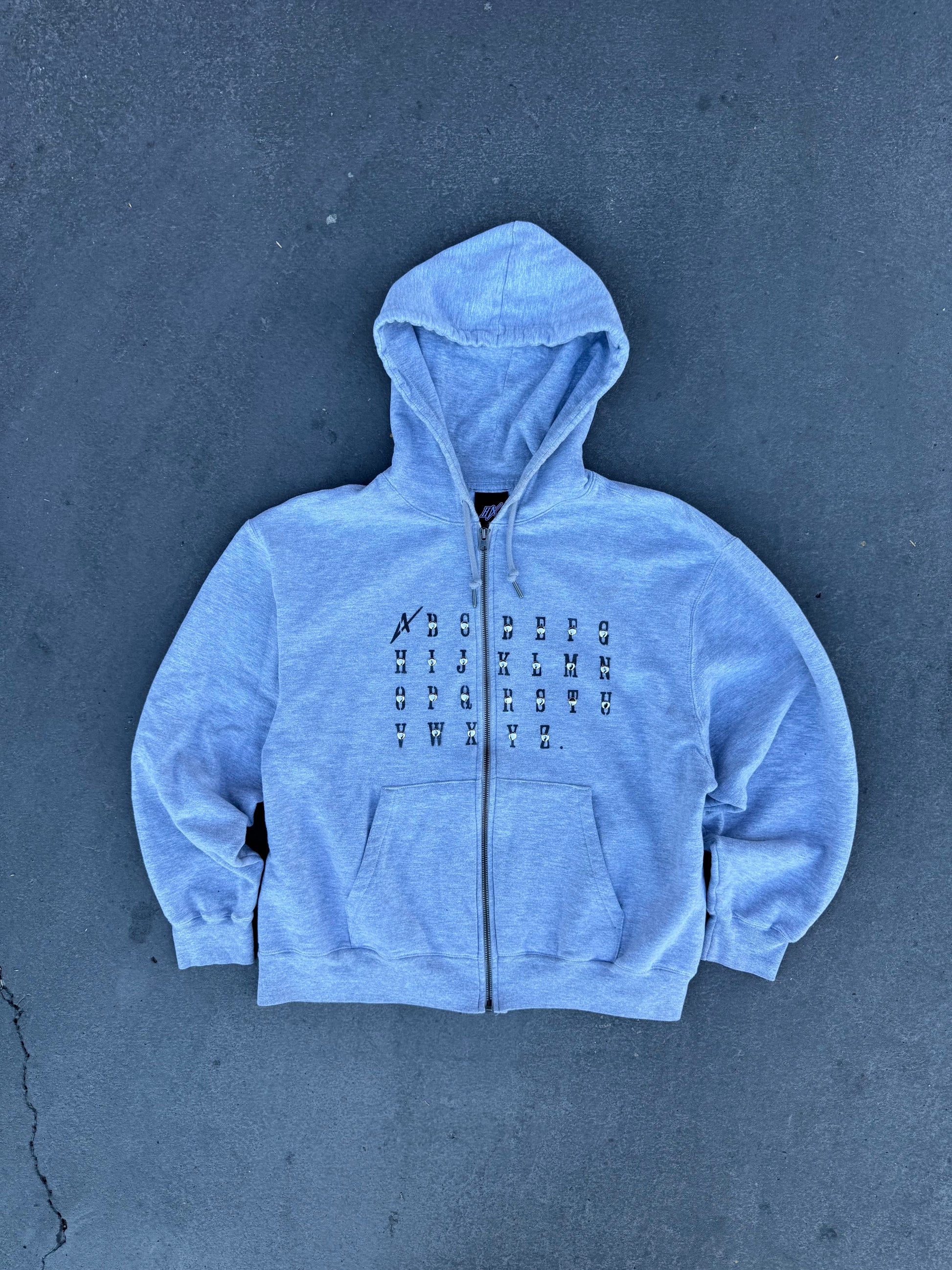 A soft, comfortable light gray zip-up hoodie featuring the signature HRTLSS alphabet graphic across the chest. Minimal, clean, and easy to style – this is the essential everyday hoodie with a subtle artistic twist.